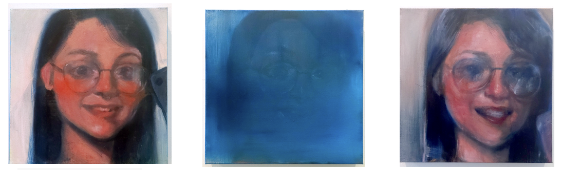 Within the Grid there are paintings in which I referenced my own image. These are all self-portraits based on a mirror selfie of myself from 2017. Their inclusion in the grid implicates me within this landscape. My own forced smile and my own face distorted every time I repainted it.