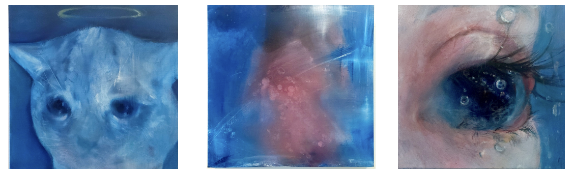 The work of this thesis is figurative, but the portraits are not interested in capturing the essence of the person depicted. The parts of the face become something more like a landscape to explore an internal psychological experience. The subjects are often not real people, but imagined composites built from fragments of online imagery. Some are references to memes and viral visuals that repeat in excess.