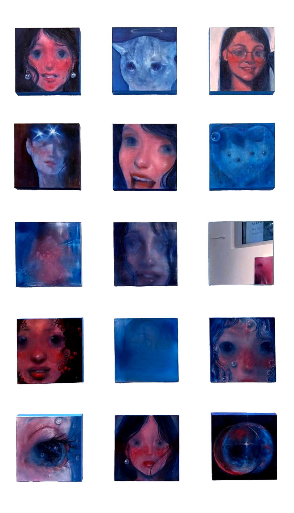 The Grid is the culmination of my exploration into images from social media. The Grid is a piece comprised of fourteen individual 12 by 12 inch paintings and one 12 by 12 inch mirror on panel. Together these images were intended to function as one piece.